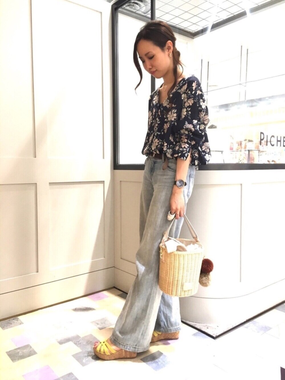 新作サンダルが登場しました♡ 毎年大人気のクッションがとっても気持ちいい厚底サンダルです! デニムにイエローで合わせてみました。 カゴバックもポイントです♡