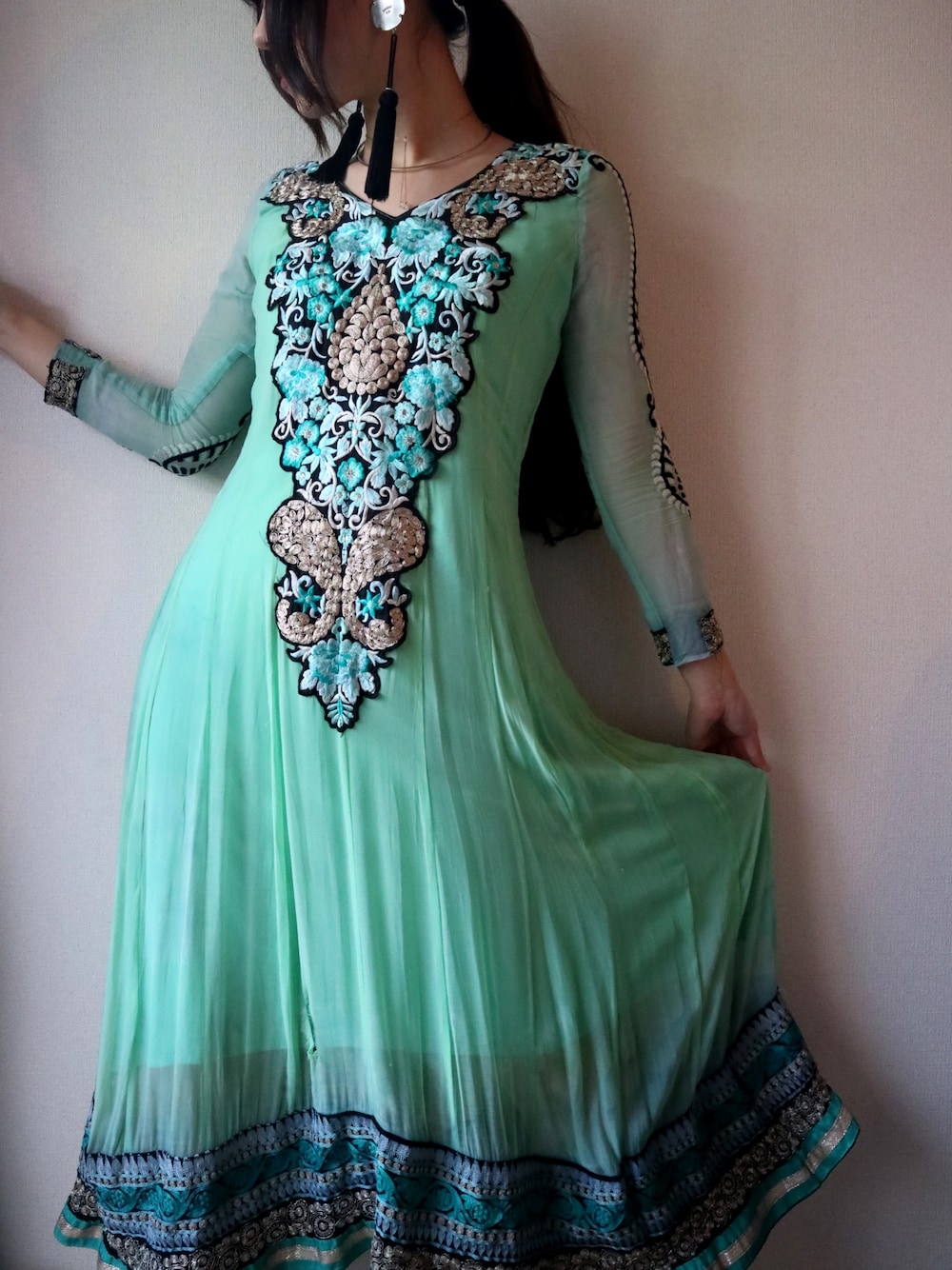 グリーン系のワンピース/ドレスを着用したレディースの春コーディネートの1枚目の写真