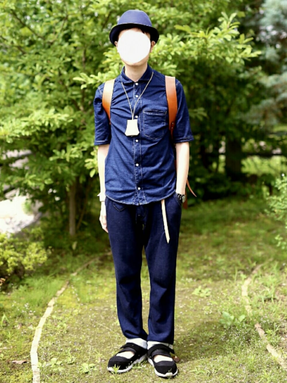 カーリーのMAZARINEシリーズをセットアップ風に着てみました。デニムに見えて、スウェットなのでほとんどジャージのように着心地が良いです。 写真撮ってたら蚊に刺されました。