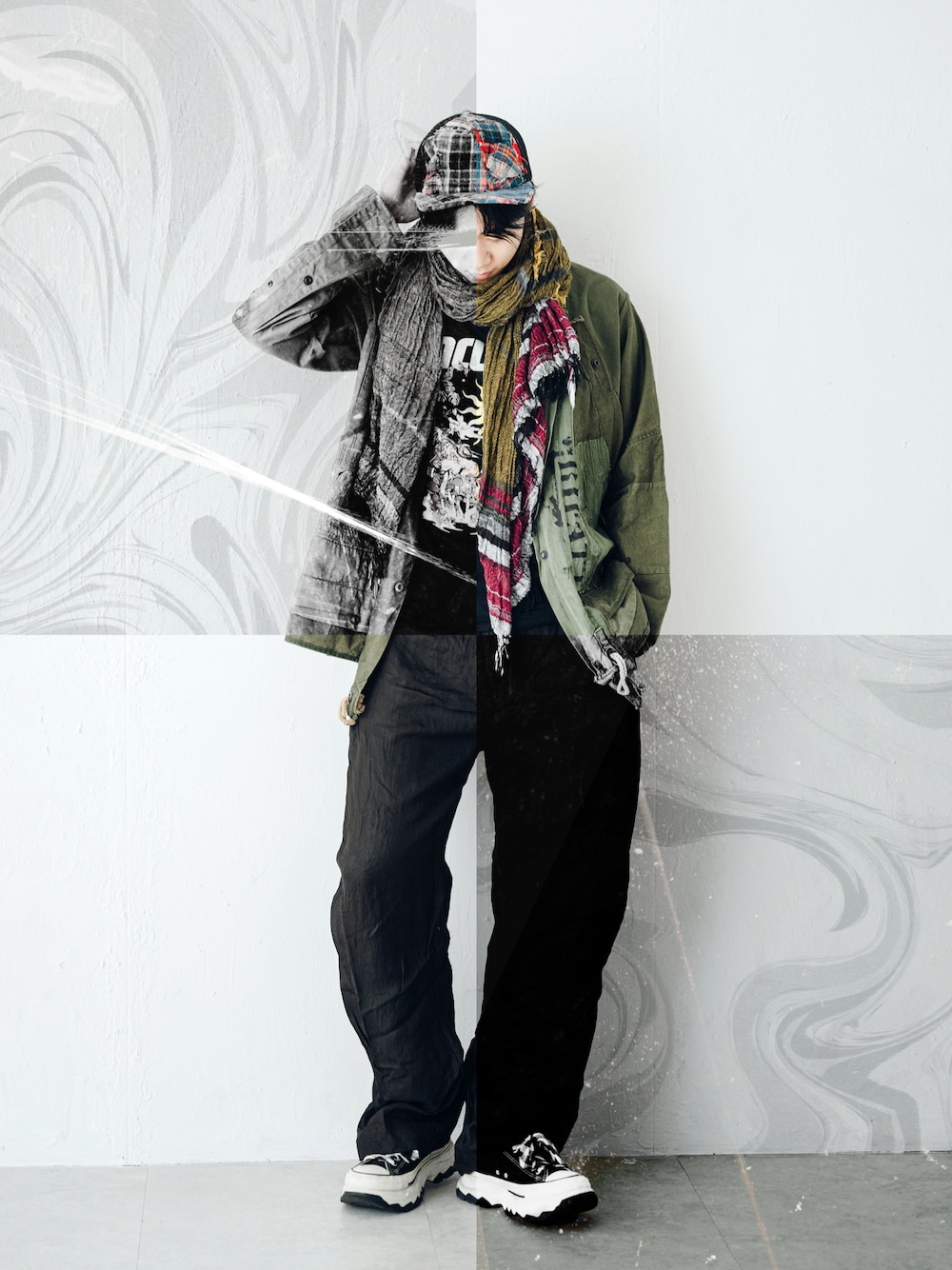 Cap: Greg Lauren @greglauren Scarf: 玉木新雌/タマキニイメ @tamakiniime Procured from kune/クウネ @___kune Jacket: rifatto /remake/art @rifatto_handmade T-shirt: incubus @incubusofficial Pants: Transit® @transit_officialpage Shoes: モデル私物 Model: seidai @seidaaaaaaai Photographer: もんた|土門裕 @yutapic Coordinator: @nt.tokyo.jp Story: 秋が来るとは思えない気候ですが、 あと少しで、額の汗が解放されて、腕周りを優しい繊維が包んでくれる季節。 そう考えると、とても胸が膨らみます。 先月からはじめた、Photograph across ArtCollage Project。 都内にて、撮影チームを組んでやっています。 人は完璧ではないから、素のとき以外は本能で「なにかを隠そう」とする。日常のほとんどの場面がそうであると思います。 表の顔が存在して、裏の顔も存在する。 おそらく すべての人がそうであるように、SNSもまた、表と裏の顔が、タイムラインに流れては消える繰り返しです。 人にとっては衣。写真にとっては素材。そんな生地や服の表現もまた、 着るもの・扱うもの、すべてにおいて幾何学のように異なります。 感じること。様々な感じ方。自分は好きか、嫌いか、まずはその選択で良いと思います。 その後、なぜ好きと感じるのかを考えてみる。好きなら、取り入れてみたいと思うようになる。 そのスタイルを、真似てみたいと思う。作って・見てみたいと思う。 選んだスタイルは、自分の鏡。選ばれたモデルは、自分が考える、その人への憧れ。 そんな写真たちを、発表していきます。