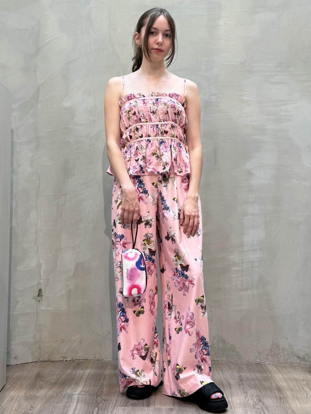 ご覧いただきありがとうございます✨ Desigual原宿店です❕ 可愛らしいピンクの花柄セットアップで 甘めガーリーコーデの完成❣️ ベアトップ×ワイドパンツの組み合わせが リゾート感たっぷりの夏スタイル🌸 ブラックのサンダルでバランスを取った フェミニンなオールインワン風コーデです💕 詳細については原宿店へお気軽にお問い合わせください📞