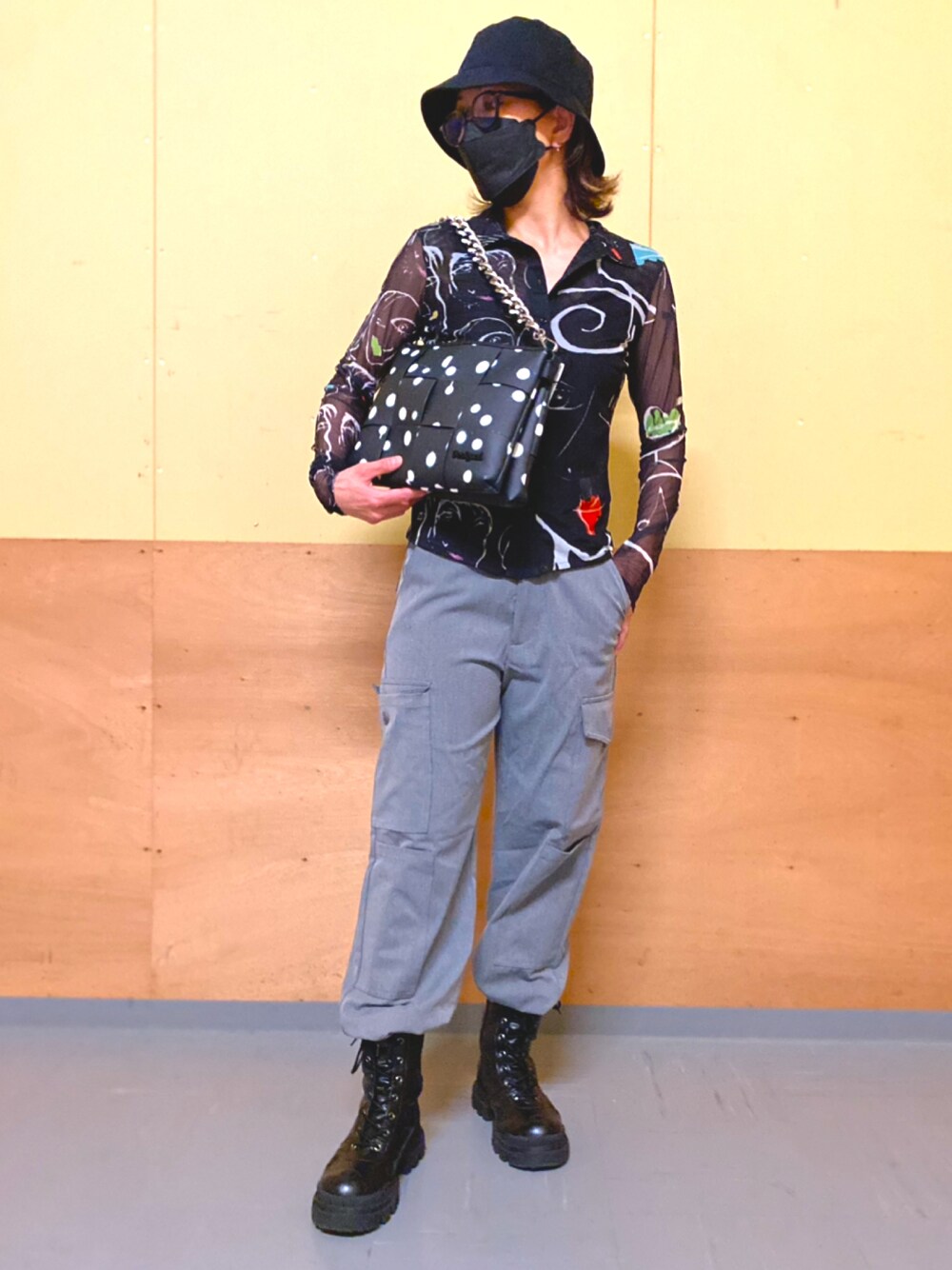 ▢ ▣ ▢ ▣ ▢ ▣ ▢ ▣ ▢ ▣ ▢ ▣ ▢ ▣ ▢ 💄🖤モード系コーデ🥀🍷🚬 ▢ ▣ ▢ ▣ ▢ ▣ ▢ ▣ ▢ ▣ ▢ ▣ ▢ ▣ ▢ ポイントはドット柄のバッグ🤷🏻♀️ ❔ フェイスプリントのシアーシャツに合わせても問題なし🌳🍐 ボトムスが無地の時はトップスとバッグは柄物でGO〜🏄🏄♂️🏄🏄♂️🏄🏄♂️ ★TOPS(24SWTKY5) 身長160cm→Ssize着用 ☆BOTTOM(23WWPW30) 身長160cm→XSsize着用 ★BAG(24SAXP10) ☆BOOTS(23WSTP14)