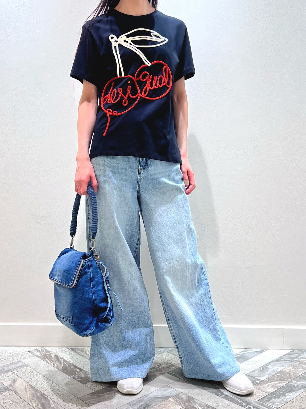 デシグアル神戸阪急店です☆ ご覧いただきありがとうございます♪ Tシャツ×デニムのシンプルコーデ🌟 シンプルだけどTシャツの存在感は大きく、差し色の赤のチェリーデザインがアクセントで可愛いです🍒 デニムのバッグはリュックとしても使えて2wayで優れもの✨ Tシャツは標準的なサイズ感です デニムはかなりワイドでウエストも大きめなので普段のサイズより1つ小さいサイズでも良さそうです 丈が長いので170センチのスタッフでも丈直しが必要なくらいです、試着なし購入の場合は丈感にお気をつけください⚠️