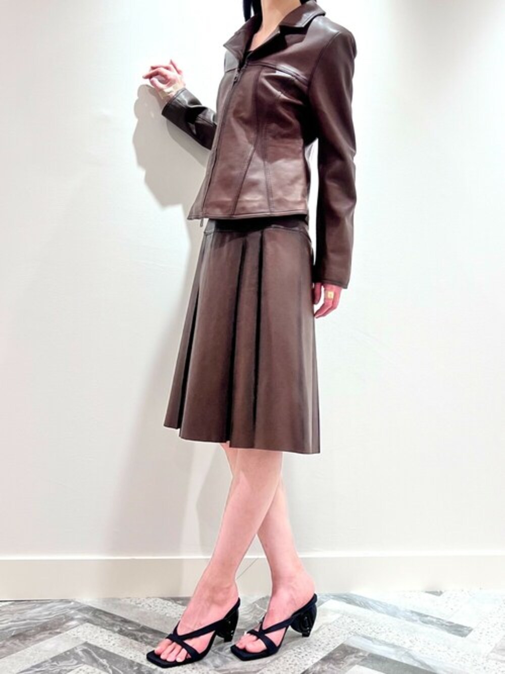 デシグアル神戸阪急店です☆ ご覧いただきありがとうございます♪ ペプラムの裾とラペルカラーが付いたフィット感のあるレザーバイカースタイルのジャケットはシープレザーの本革素材で高級感のある一品です 高級感があるのでパーティーシーンなどオケージョンにも対応できます♪ ジャケット:25SWEWXD/6000 87,900円 スカート:25SWFWX4/6000 87,900円 サンダル:25SSSY01/2000 30,900円