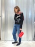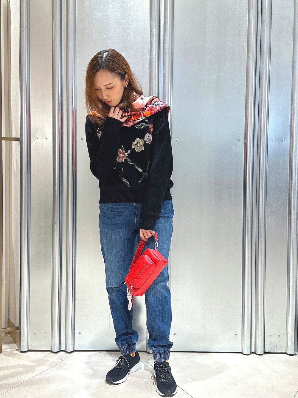 ジョガーパンツとゆったりニットを使った 秋のカジュアルコーデ‼️ 差し色で小物は赤系に統一✨ 刺繍表全体にあるので、シンプルながらも華やかに🧶 バックは定番の3wayタイプです❗️