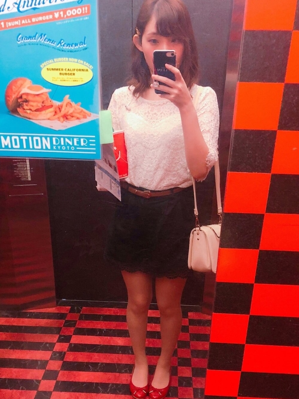 王道な白×ネイビーのコーデです トップスは総レースでボトムスの裾もレースになっているので統一感があります シンプルな綺麗目コーデです 赤のぺたんこがワンポイントです
