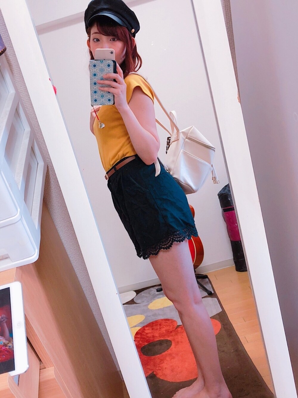 キャスケットとミニ丈ボトムスを合わせたかっただけの適当コーデです 動きやすさ重視でリュックにしました