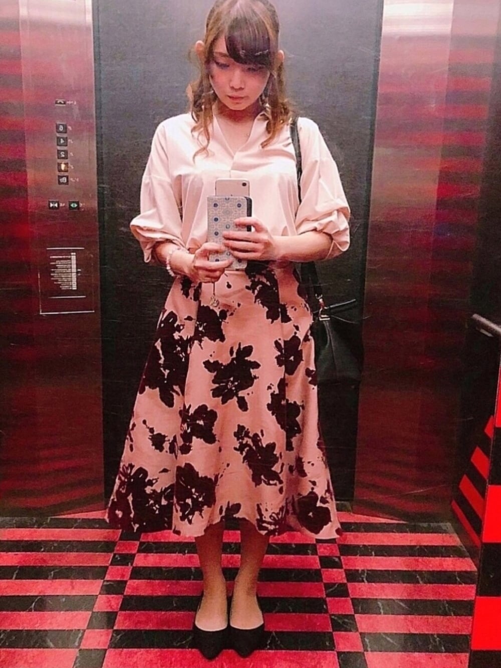安定の同系色コーデで全身ピンクと黒でシンプルにまとめました 靴はぺたんこですがスカートの丈感が長めなので脚が綺麗に見えます 最強デート服です