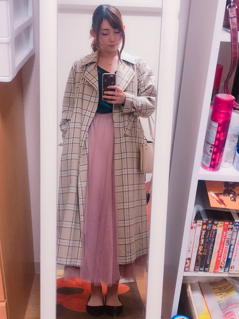 普段はあまりしない青×ピンクです トレンチのチェック柄のラインにブルーが入っているのでニットと合わせました ブルー×ベージュがすきですが、ボトムをベージュにしたらトレンチの後ろ側と同化してしまって野暮ったいのでふんわりしたピンクのチュールスカートにしました