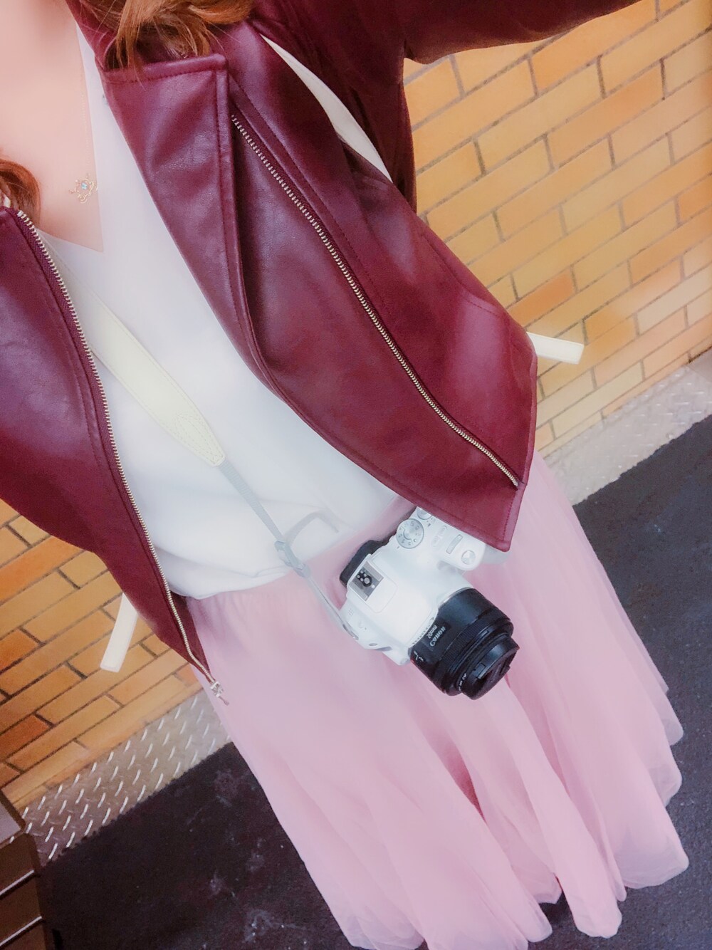 ボルドーのライダース×ピンクのチュールスカートで同系色コーデです お花見撮影の日だったのでピンク系で行きました 靴は見えてませんが真っ赤です