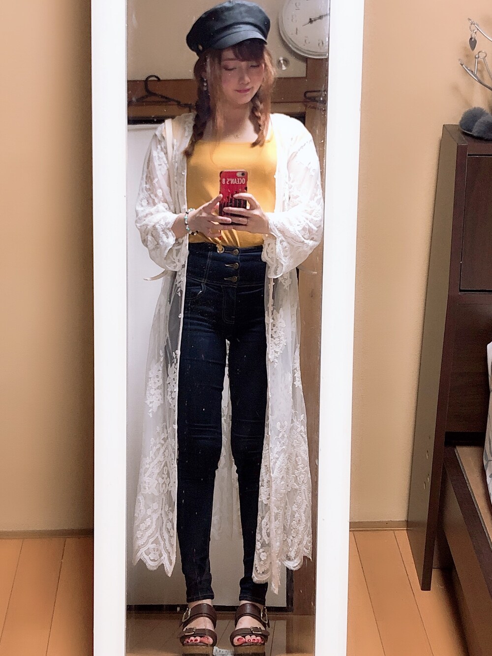 雨なのでカジュアルに動きやすさ重視でデニムとカットソー、肌寒いのは困るので季節感を出してレースワンピースを前開けで羽織ってレースガウンにしました くせ毛お化けなのでぐるんぐるん防止に三つ編み+キャスケットで最強防備です!