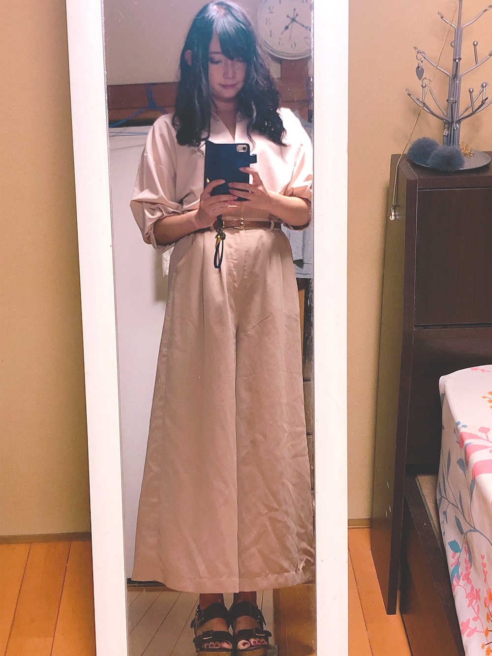 久しぶりにちゃんとした服を着て出かけます 涼しくなってきたので久しく着てなかったピンクベージュのシャツを このシャツに合うボトムが3つしかないので着回し力高めていきたいです