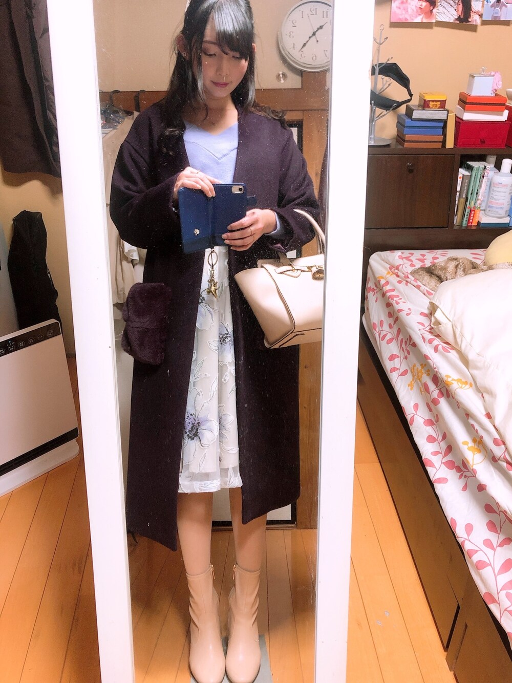 初詣&プラネタリウムに行く日だったので、新しく買ったパープルのコートと脱いだらかわいいラベンダーのオフショルニット、ラベンダー×グレーのオーガンジー花柄スカートでパープル系で統一しました
