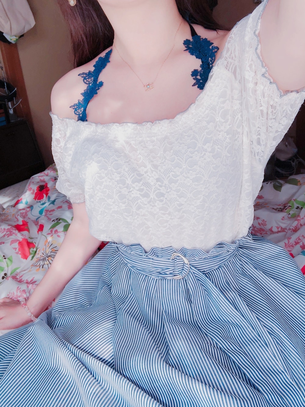 オフショルにぴったりなピーチジョンのレース×リボンのブラで後ろ姿はリボン結んでバックシャン♡ スカートもブルーで同系色にシンプルにしました この上にGジャン羽織って全身青!