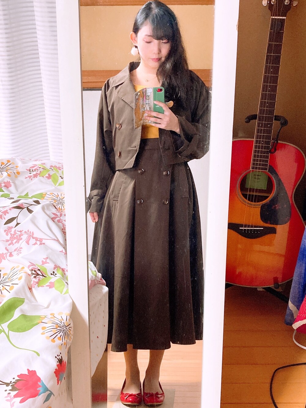 ブラウン、マスタード、赤で秋色にしました 昨日寒かったのでカーディガンも予備で持っていきます カーディガン着た時のくびれ!コルセット様様!