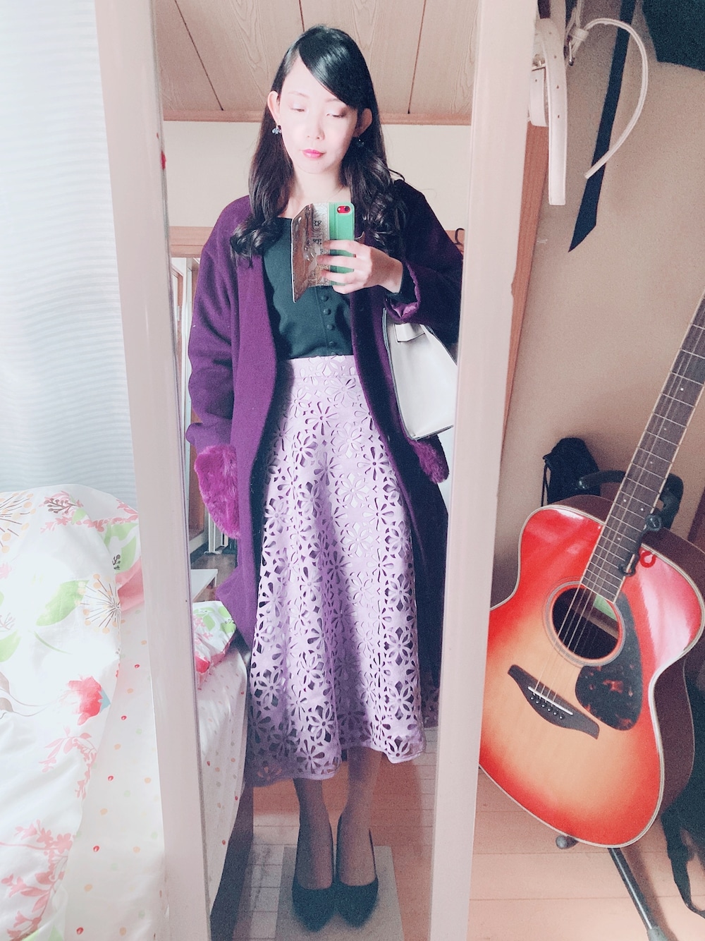 出社前にランチ行くのでゆるりと楽ちんなお気に入りのお洋服で行きます トップスの袖シースルーも、スカートのAラインとカットもだいすきです