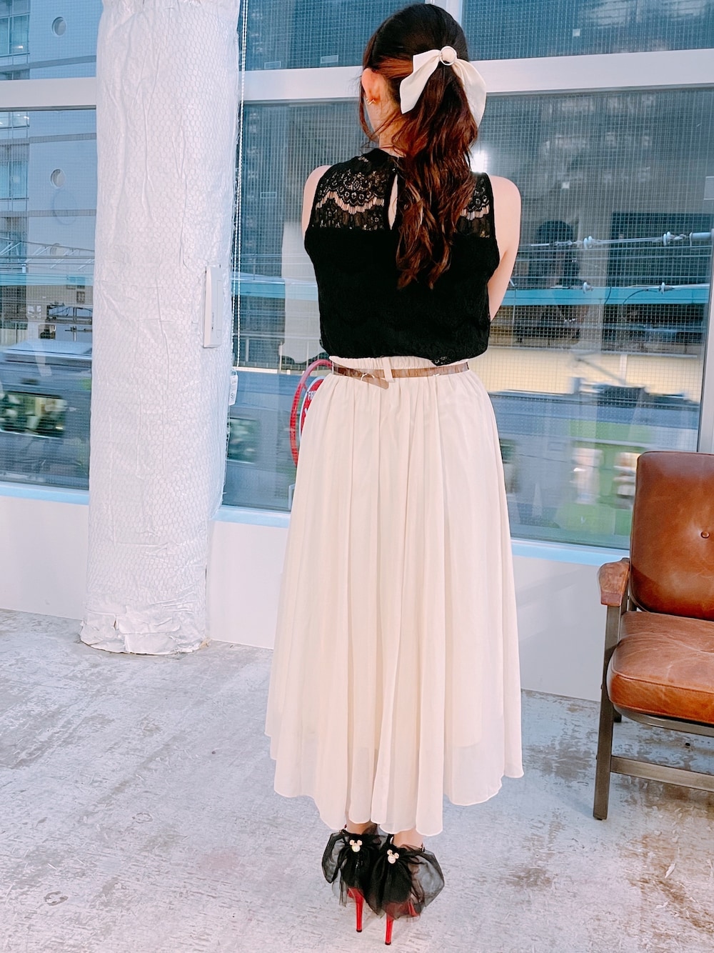 おろしたてのパンプスを履いて、モノトーンで揃えた日です ぜひパンプスの詳細を見てほしいんですが、後ろにチュールがついている上に、隠れミッキーまでいて最高に足元がかわいいんです…!