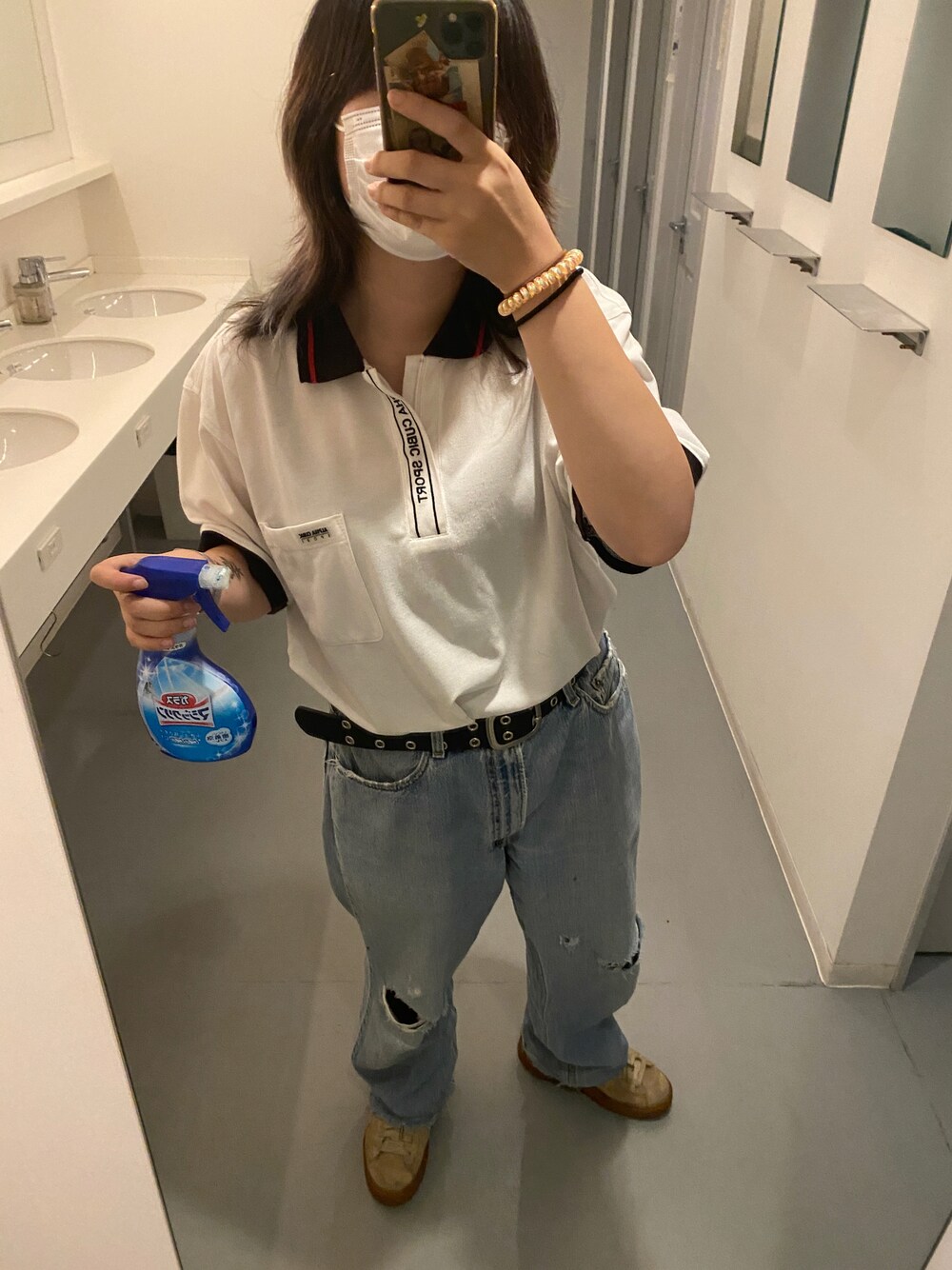 高校生の時はポロシャツばっかり着てたけど最近着てないな〜と思いました。デニムはどデカすぎて落ちてくるしズルズルのをベルトで締めて裾はぶち切って膝も気づいたら穴が空いてました。ボロボロです。 スニーカーはだいぶ前に韓国で買いました。これもぼろぼろ