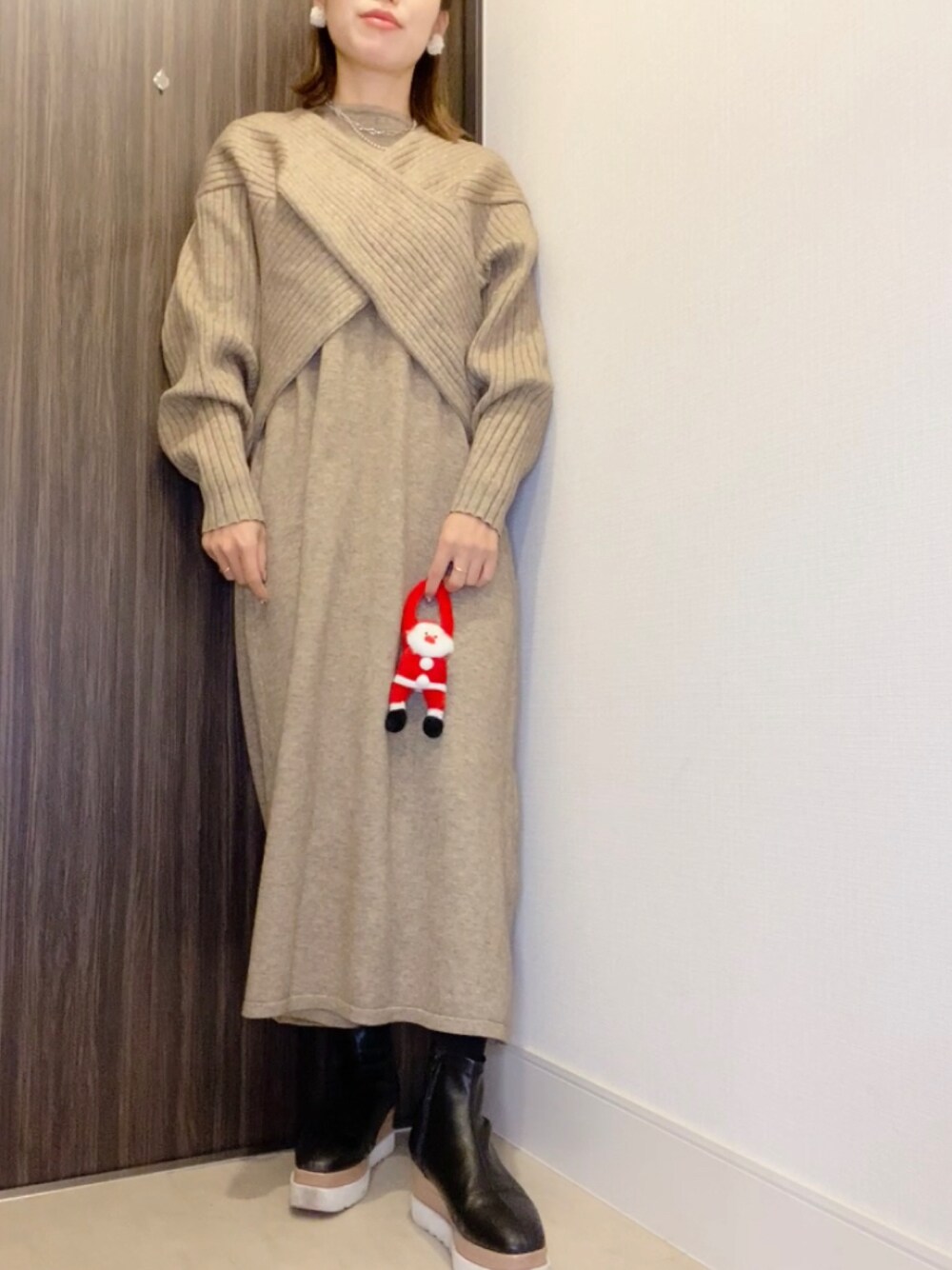 でつのワンピース「クロスデザインニットレイヤードワンピース」を使ったコーディネート