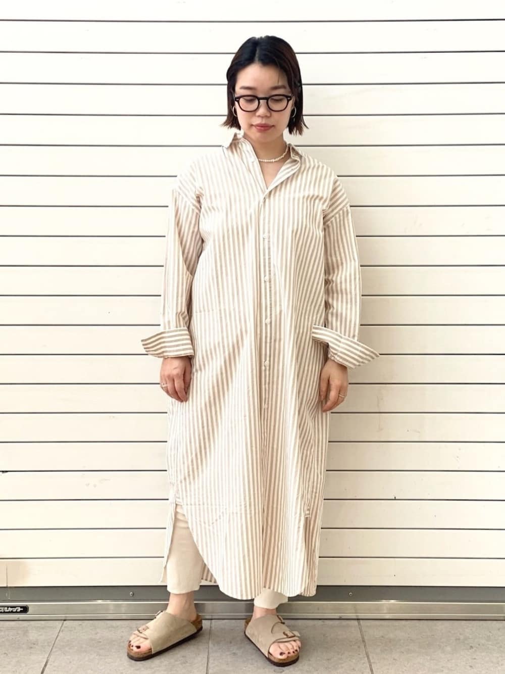 ベージュワントーンコーデ。 ストライプがベージュなので主張し過ぎず大人な印象に。
