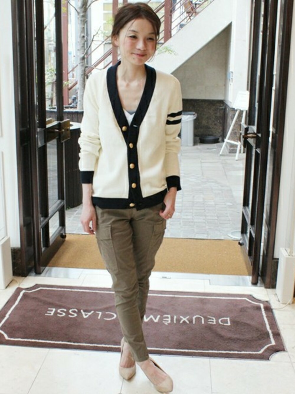 大人気の配色スクールカーディガンに新色のアイボリーが登場しました。全体的に色味を抑えた、大人のカジュアルスタイルです。