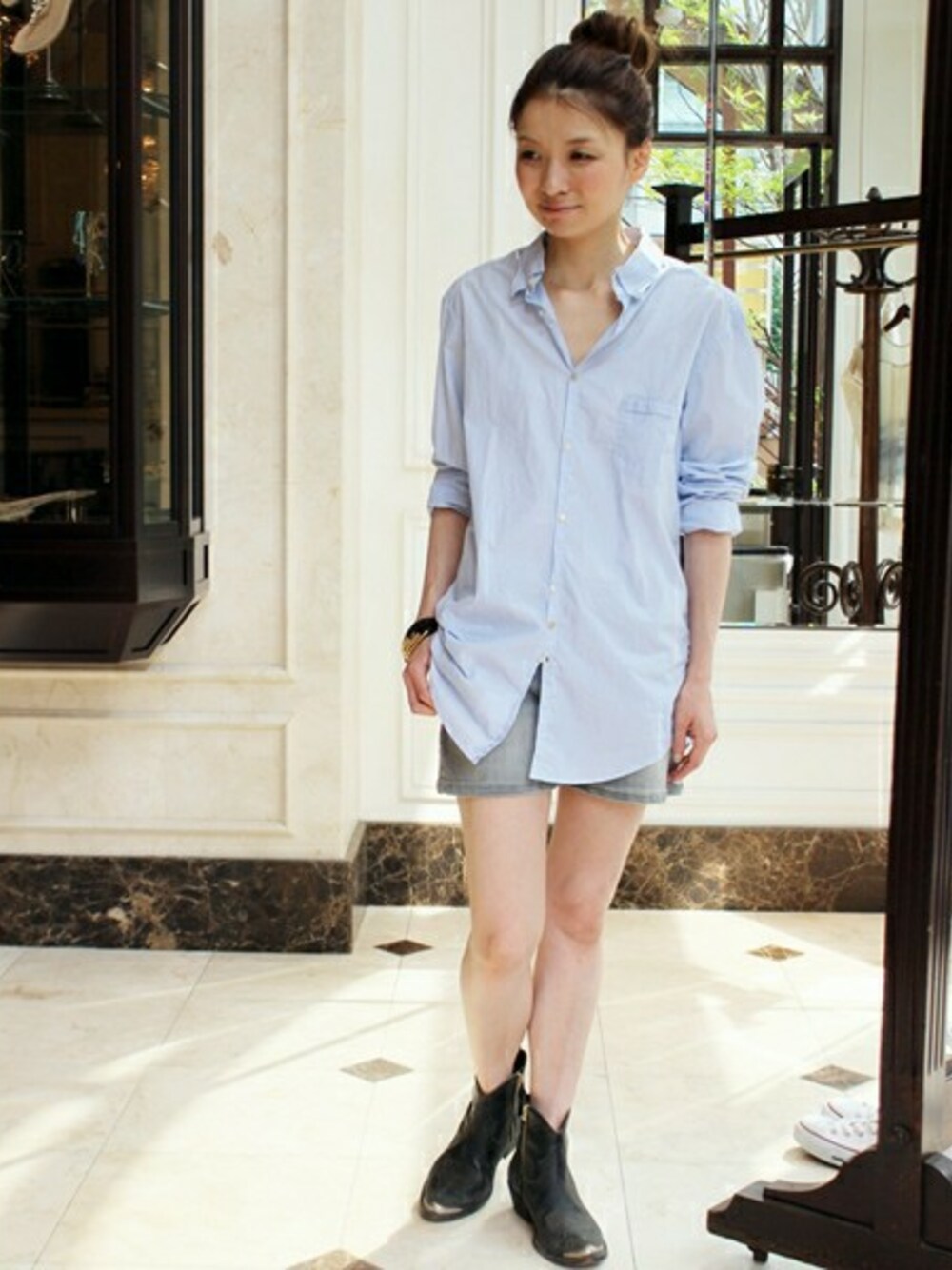 女性が着るとちょっとゆったりしたシルエットになるサイズ感の『AGLINI』のシャツ。 服の中で身体を泳がせる感じが女性らしい華奢さがあって可愛いです