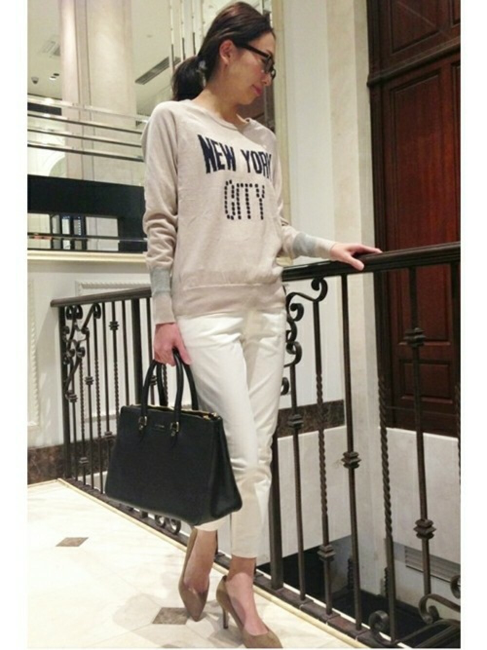 クロップド丈のパンツにパンプスを合わせて、カジュアルスタイルに女性らしさをプラス。 スクエアフォルムの大き目バッグでスタイリッシュに仕上がります。
