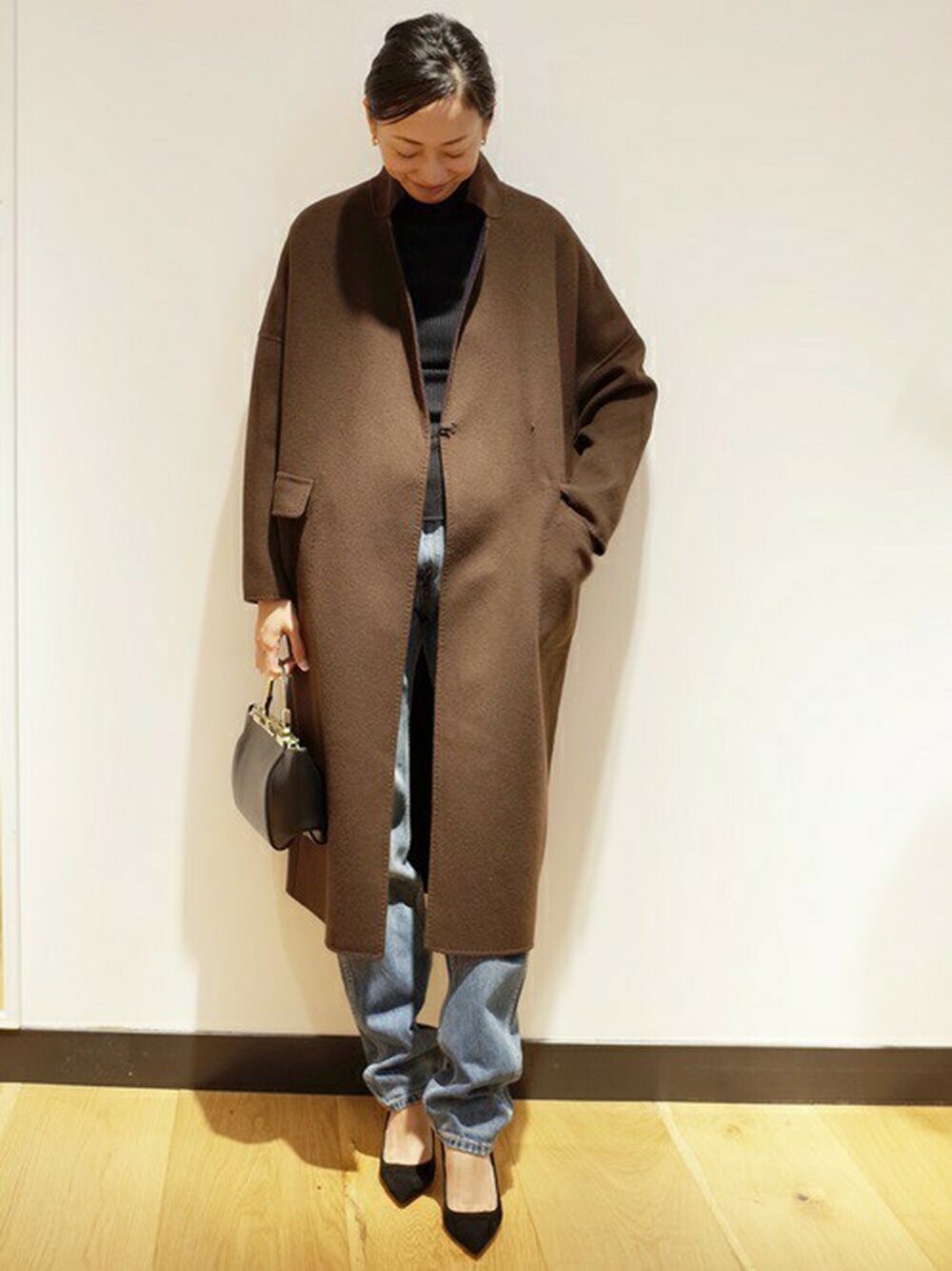 -COAT- 1点1点ハンドメイドで作っている仕立てがきれいなHamiltonウール リバーコート。 肩のこらない軽くて暖かいウール素材で、デイリーに大活躍のベーシックアウター。 品のあるブラウンを表にデニムと合わせて、シンプルだけど旬なテイストをプラスしたスタイリングです。
