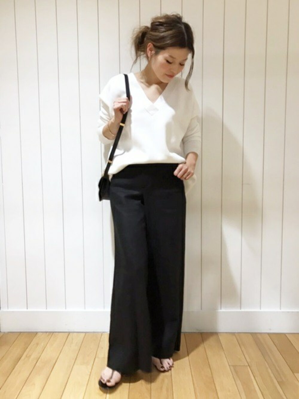 オーバーサイズのニットも、少しだけ前をいれてバランスをみる。 少しの工夫で、ワイドパンツとだってしっくるくるベストバランスが見つかる!