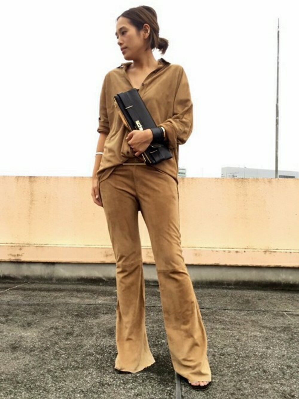 スエードは’70年代テイストの気分をぐっと盛り上げてくれる素材。 滑らかな手触りと品のいいベージュの色合いが女性らしいです。 GOLDのプレートやBLACKを効かせて、モード感をプラス。