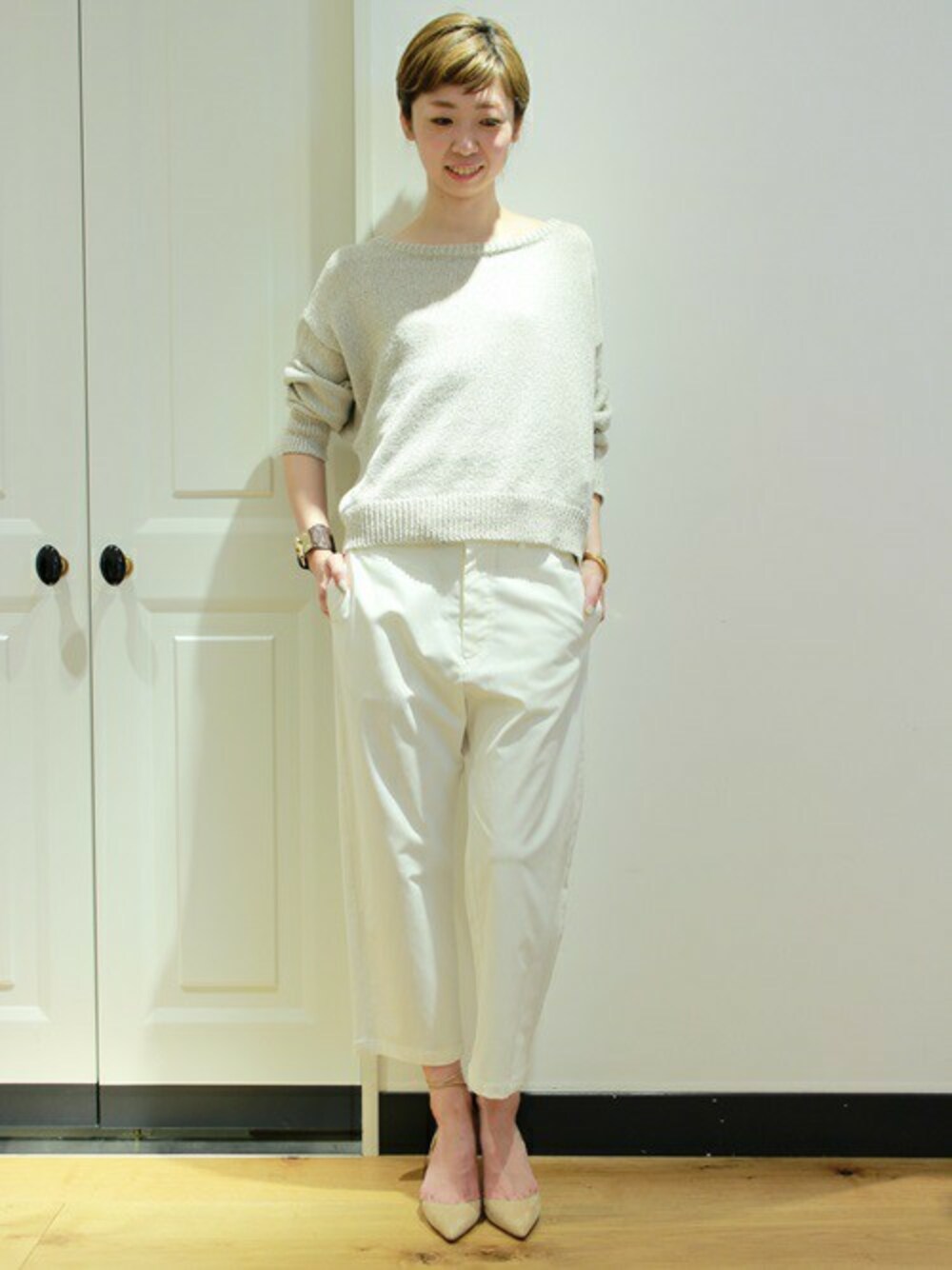 クリーンな印象のワントーンスタイリングは、今年おすすめのコーディネート! スウェードパンプスとパンソンレザーのバングルの小物使いがポイントです。