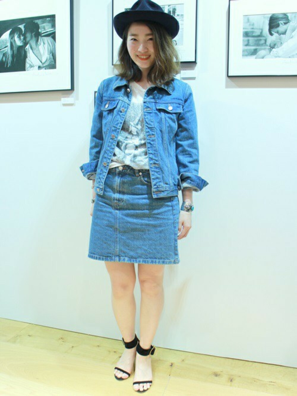 デニムのセットアップがポイントのヴィンテージライクなスタイリング。 ハットとサンダルをブラックで合わせて、モード感をプラスしました。