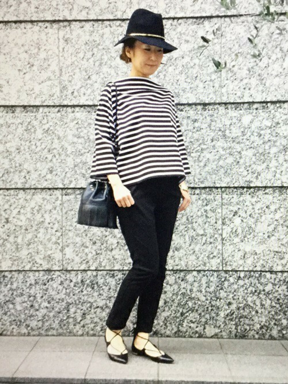定番のボーダープルオーバーもモノトーンなアイテムと合わせてモードな雰囲気に合わせても素敵です。