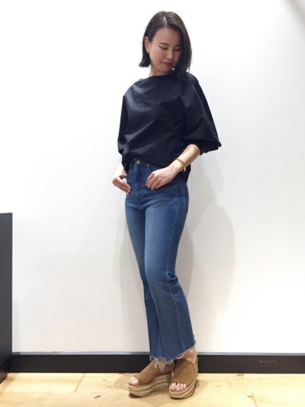 -BLOUSE- ハリのあるタイプライター生地が綺麗なブラウス。 デニムと合わせたカジュアルなコーディネートもおすすめです。 ソールとアクセサリーのさりげないゴールド使いもポイント。