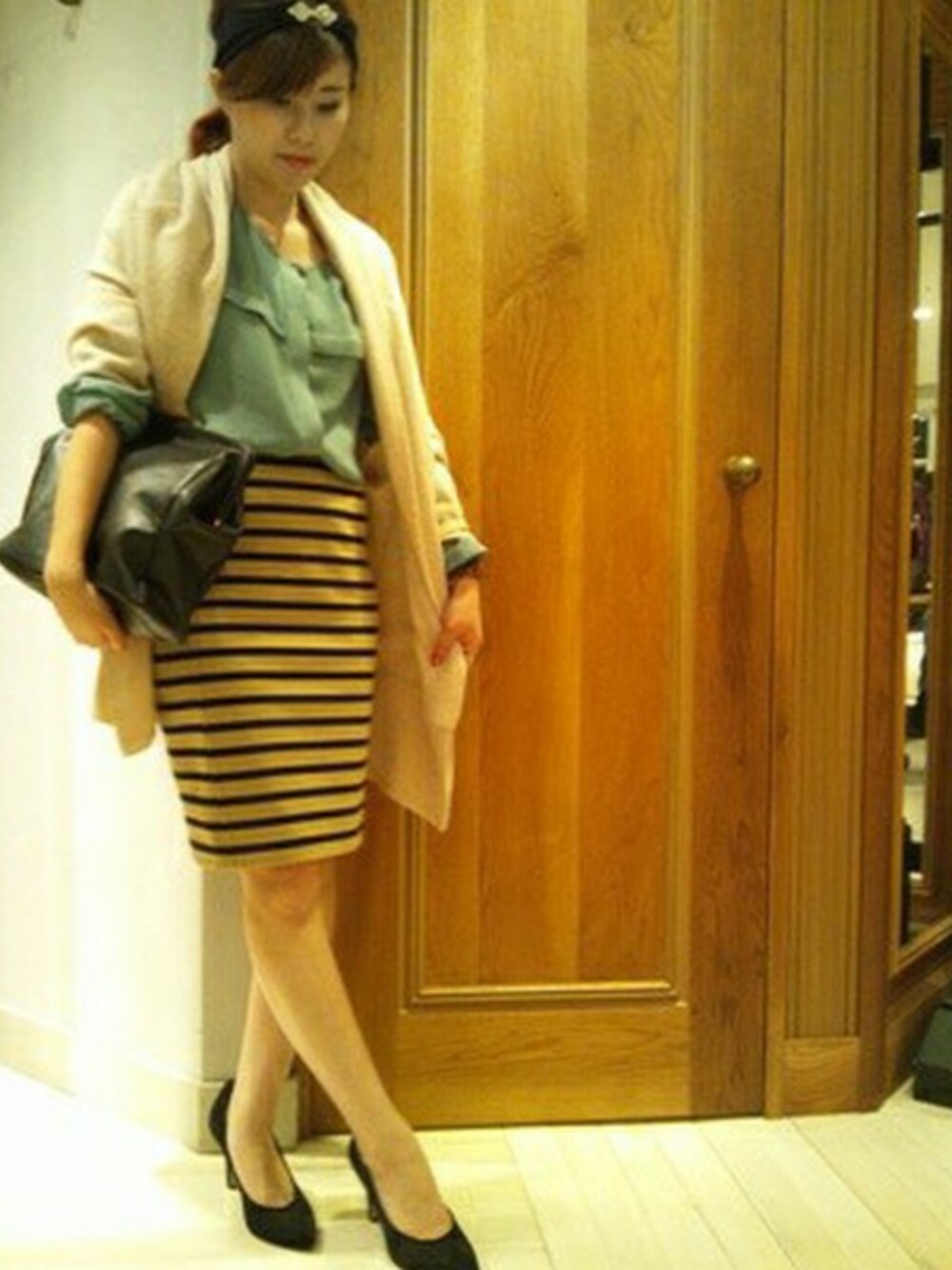 流行りのタイトスカートに水色のブラウスをチョイス♪ 今年らしいスタイリングに仕上げました❤