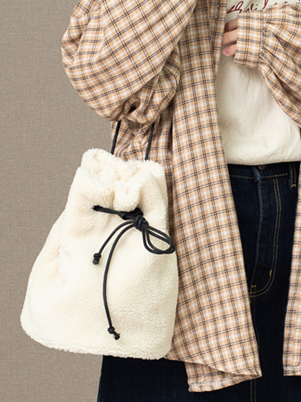 DEVICEのショルダーバッグ「Rename ファー/ボア 巾着ハンドバッグ」を使ったコーディネート