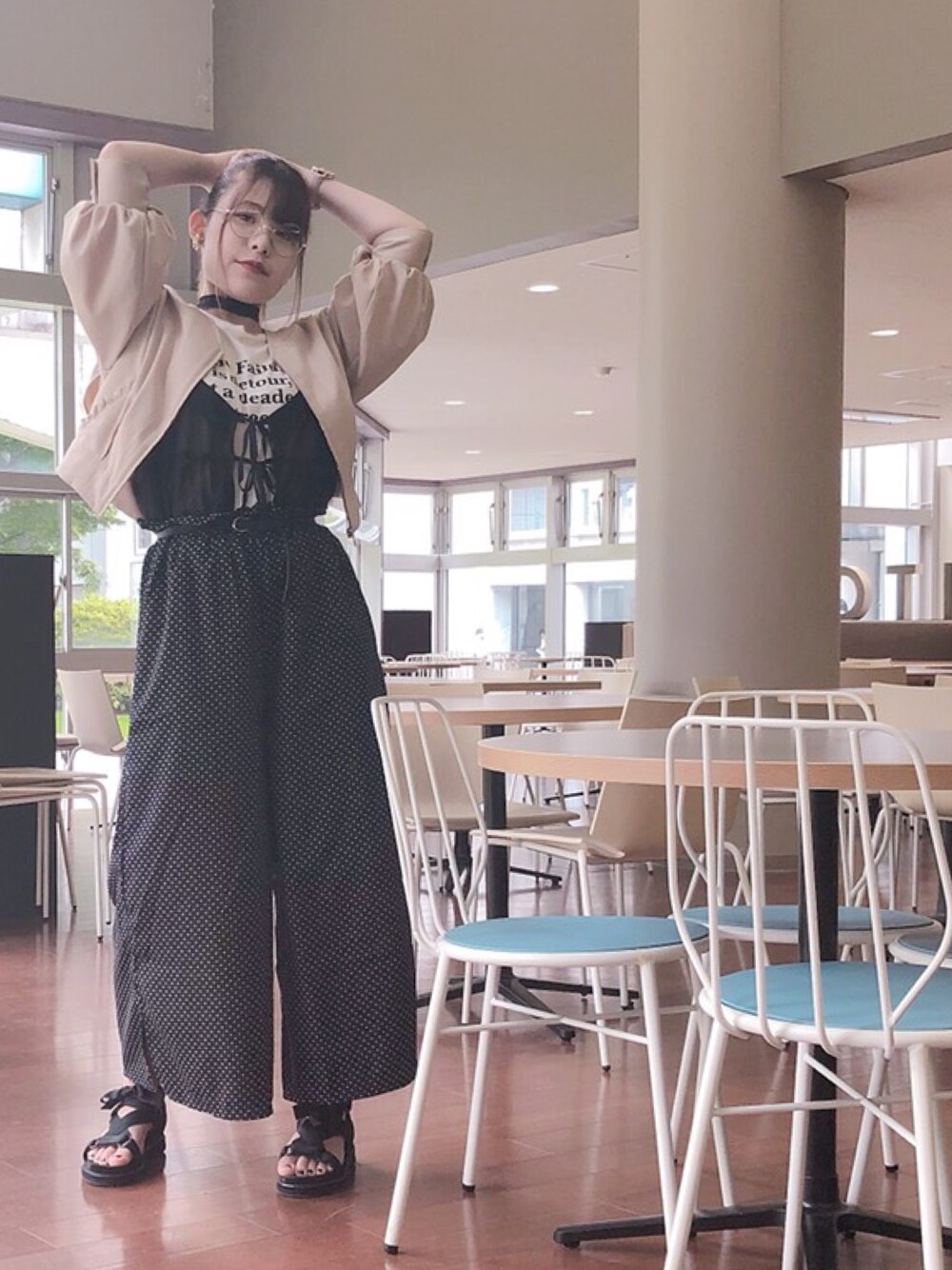 月曜日の大学コーデ💭 曇りでやる気が出ません…😂 ドットのワイドパンツデビューしました♡ バディに撮らせた💌