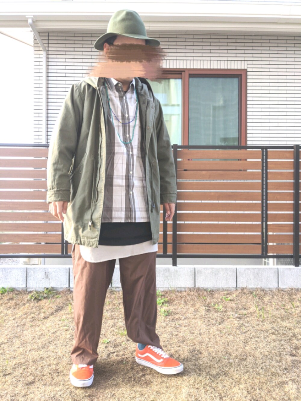 どもー。こんちゃ。 今日はいい天気になった中ご覧頂きありがとーございます。 今日も元気にレイヤード。 アウターはモッズコート〜。 カーキの。 トップスはビッグシャツ。 チェックの。 インナーにロング丈。 パンツほワイドパンツ。 ブラウンの。 足元はスニーカー👟 オレンジの。 ボーシはツバ広ハット。 カーキの。 カーキ✕ブラウンのゆるコーデ。 今日のコーデはコンナンでしょー。 イイネお気に入りフォローありがとーございます❗ ソレじゃまた〜。 気温15℃