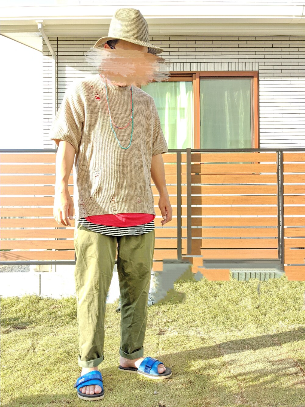 ドモ。こんちわー。 緊急事態宣言が解除された中ご覧頂きありがとーございます😉 今日も元気にレイヤード〜。 トップスは半袖ニット〜。 ベージュの。 パンツはチノパン🍞 カーキの。 足元はスポーツサンダル〜。 ボーシは麦わら帽子〜。 カーキの。 ベージュ✕カーキコーデ。 今日のコーデはコンナン㌥ョ。 イイネお気に入りフォローありがとーございます😉 それじゃあまったねー❗ 気温26℃