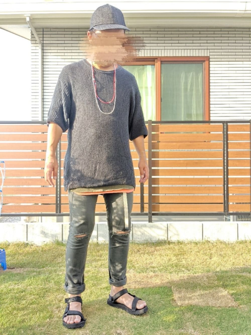ドモー。こんつわー。 もう夏がすぐそこまで来てる中ご覧頂きありがとーございます。 今日も元気にレイヤード〜。 トップスは半袖ニット〜。 ブラックの。 インナーにロング丈〜。 カーキとオレンジて意外と合う。 パンツはダメージスキニーパンツ。 チャコールグレーの。 足元はスポーツサンダル〜。 黒の。 ボーシはキャップ〜。 これまた黒の。 モノトーンにレイヤードで色味を。 今日のコーデはコンナン㌥よー❗ イイネお気に入りフォローありがとーございます😉 今月も宜しくお願いしまーす。 ソレジャまったねー❗ 気温29℃