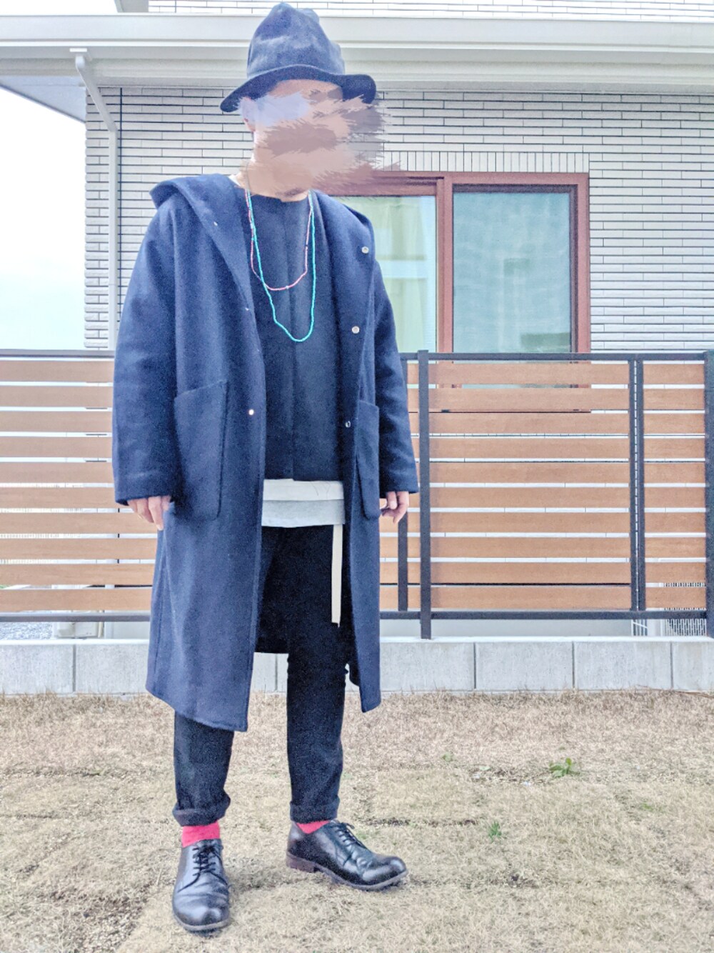 ハイドモこんちわあー。 緊急事態宣言が延長された中ご覧いただきありがとうございます❗ 今日も元気にレイヤード〜。 アウターはロングコート〜。 ブラックの。 トップスはプルオーバー。 ブラックの。 インナーにロング丈。 パンツはスキニー。 ブラックの。 足元は革靴〜。 ブラックの。 ボーシはハット〜。 ブラックの。 今日はオールブラックコーデ。 レイヤードでもモノトーン。 靴下の赤で差し色。 今日のコーデはコンナンでしょ❗ イイネお気に入りフォローありがとうございます❗ それじゃ❗またー。 気温15℃