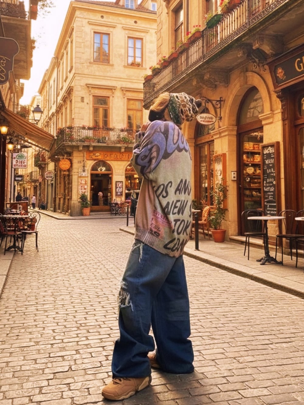 オーバーサイズの柄柄したニットでストリート感を出してみました🙋♀️短丈が流行る中逆の丈長め🤣🤣w