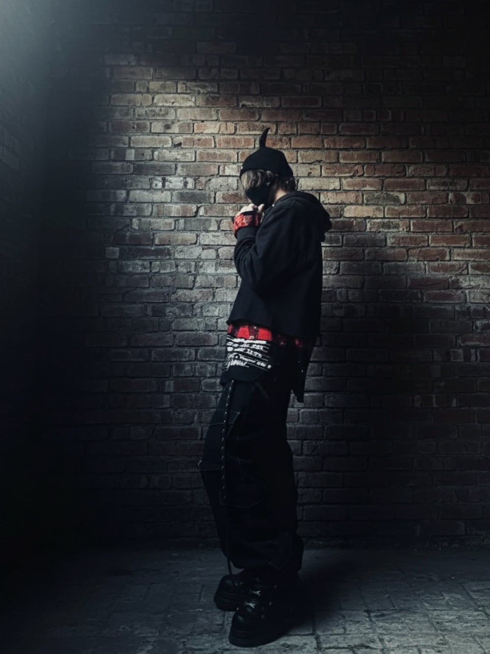 角ビーニーでパンク感を出してボロくなったSTUSSYのフーディーを短丈にカスタム🙄フーディの下にシャツを着るスタイルでパンク感レイヤードしてみました🫡なんかシルエットが悪魔ぽく🙄w