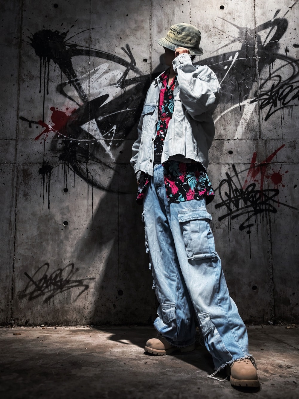 柄シャツを使ってあえての色の統一感を合わせないデニムコーデw掟破りのカラー合わせです🙄w