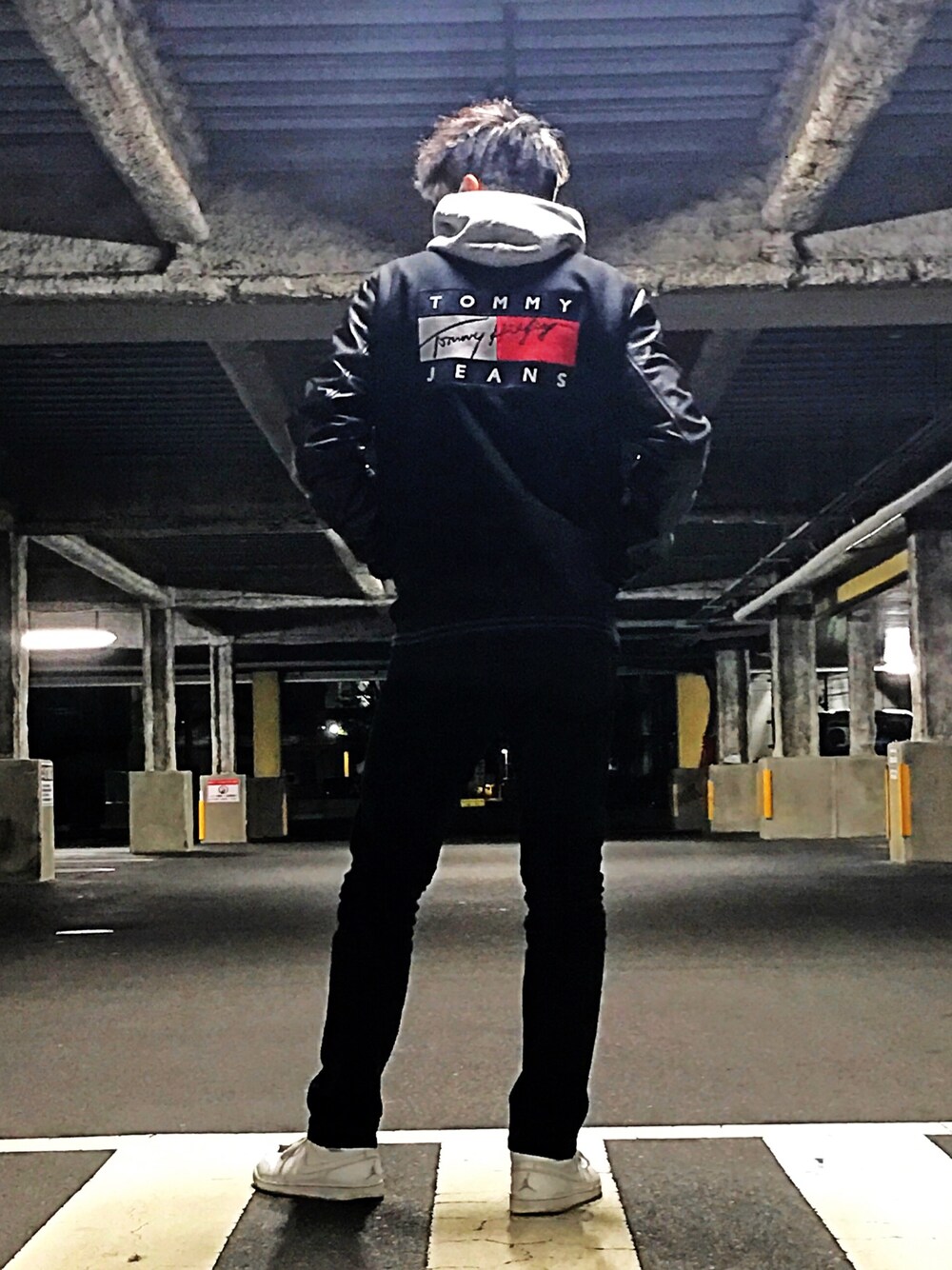 ブラック系のブルゾンを着用したメンズの春コーディネートの1枚目の写真