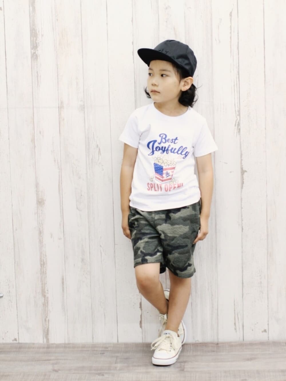 カジュアルなポップコーンTee ☻ カモフラのハーフパンツと 黒のキャップで落ち着いた印象に★