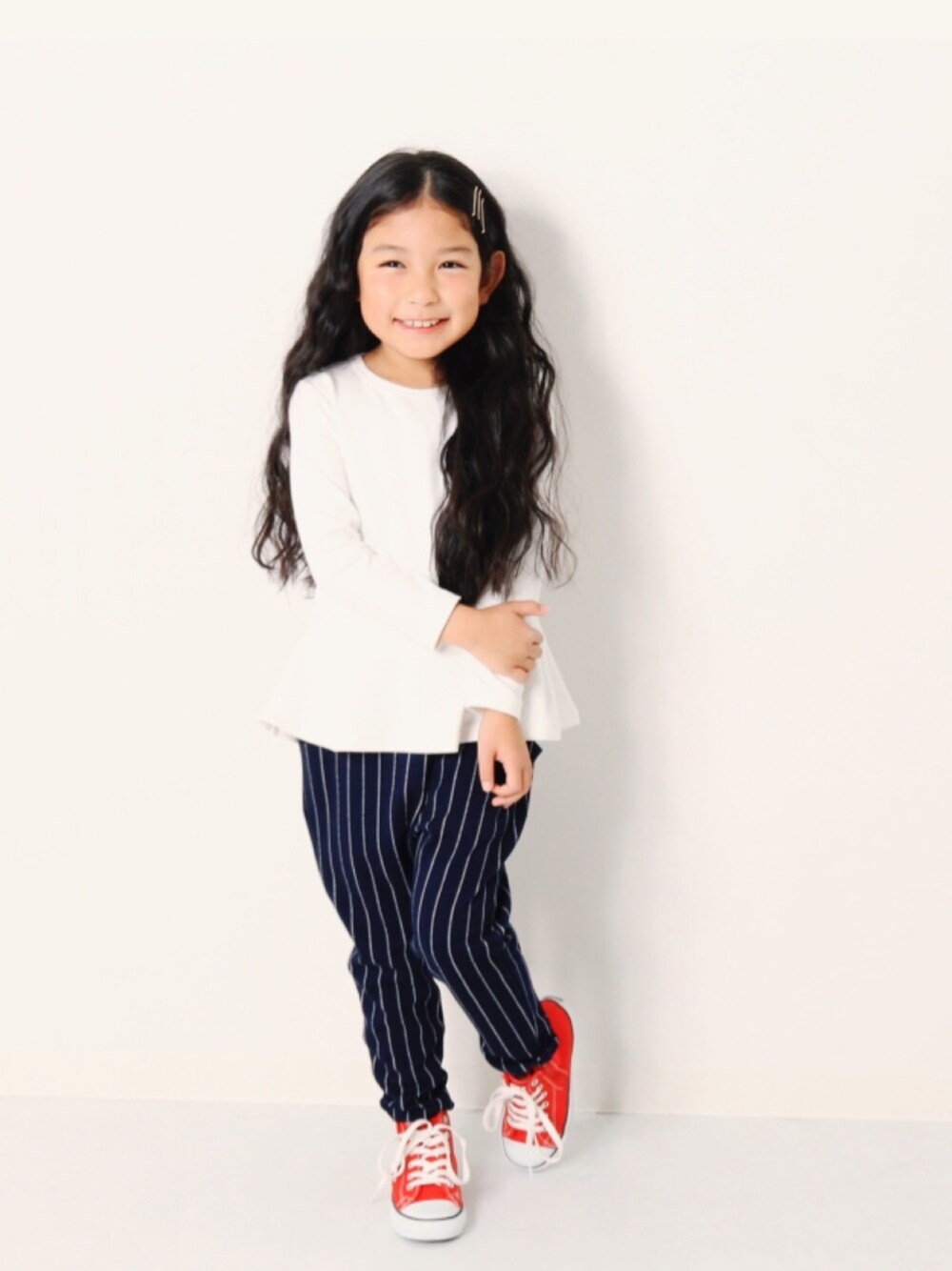 こんばんは🙌🏻 柄サルエルパンツは 女の子らしいペプラムTeeと合わせても◎ モデル身長:115cm 着用サイズ:110cm