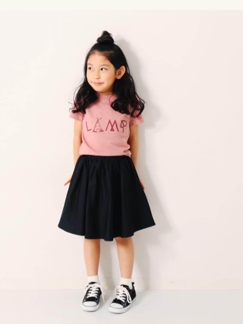 こんばんは🙌🏻 オールシーズン使える ひざ丈ギャザースカート☻❁ Tシャツにもニットにも なんにでも合わせられるから 1枚あればかなり重宝するアイテム🤤 モデル身長:115cm 着用サイズ:110cm