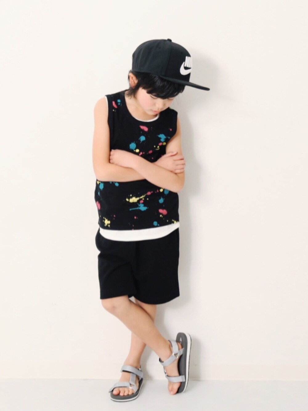 こんばんは🙌🏻 オールブラックコーデ☻ タンクトップのペンキ柄がアクセント✌︎ モデル身長:119cm 着用サイズ tops:120cm inner:110cm bottoms:120cm