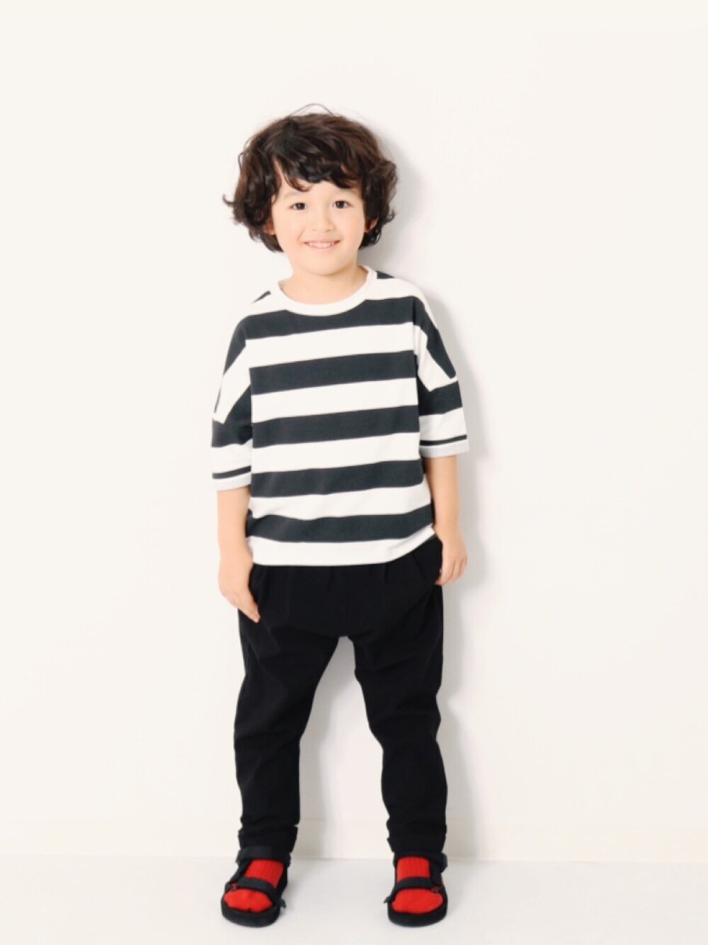 こんばんは🙌🏻 スポサン × 赤ソックス🍎 モノトーンなコーデをすると 差し色に使いたくなりますよね🤤✌︎ モデル身長:108cm 着用サイズ:110cm